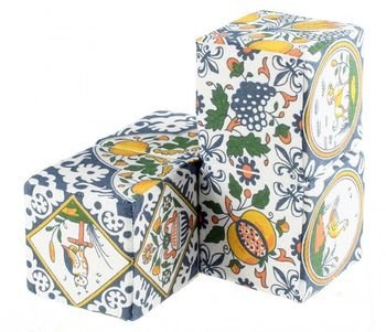 3-dimensionale Oud-Hollandse tegels. Tegelkubussen om lekker mee te spelen, te bouwen en te rammelen. Op deze kubussen staan Oud-Hollandse tegels uit de vroege zeventiende eeuw. Deze veelkleurige tegels werden veel in Nederland gemaakt toen de bekende blauw/witte Delftse exemplaren nog niet bestonden. De productietechniek, waarbij vier kleuren werden gebruikt, was overgenomen uit Zuid Europa. Ook veel zuidelijke motieven, zoals granaatappels en druiventrossen, werden oorspronkelijk in Nederland toegepast. Later werden meer Hollandse elementen verwerkt, zoals tulpen en de Hollandse Leeuw. Op de vroege tegels waren de hoekmotieven net zo belangrijk als de centrale afbeelding. Wanneer vier tegels bij elkaar worden gezet verschijnt pas het volledige, regelmatige patroon. De vier kubussen van de 4-in-1 speelkubus zijn zo aan elkaar genaaid, dat door omklappen en kantelen zes Oud-Hollandse tegel tableaux ontstaan.