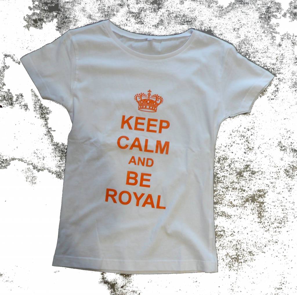 Wit katoen tshirt met oranje tekst "Keep calm and be royal"