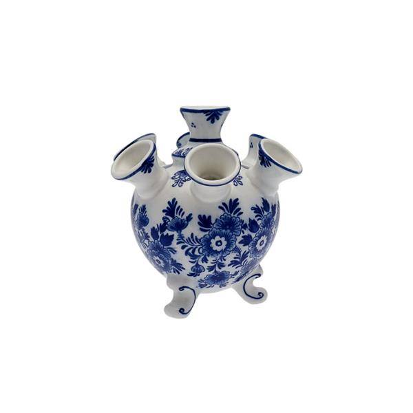 Kleinere variant tulpenvaas op pootjes met blauwe bloemen.13cm hoog